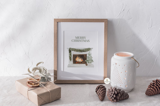 Watercolour Christmas Fireplace Merry Christmas Wall Art Print | Unframed Print