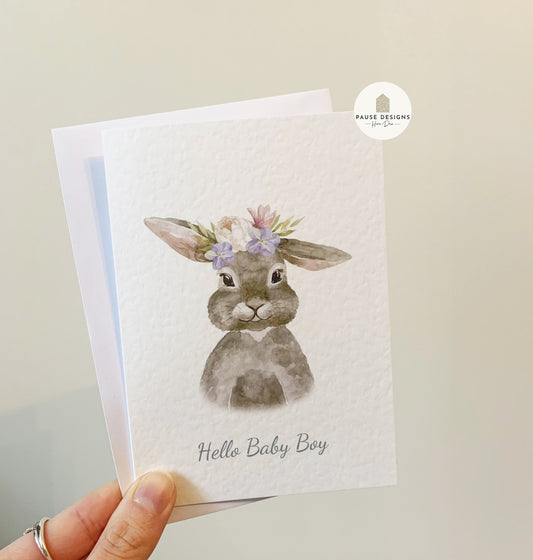 Hello Baby Boy Watercolour Bunny Rabbit New Baby Greeting Card
