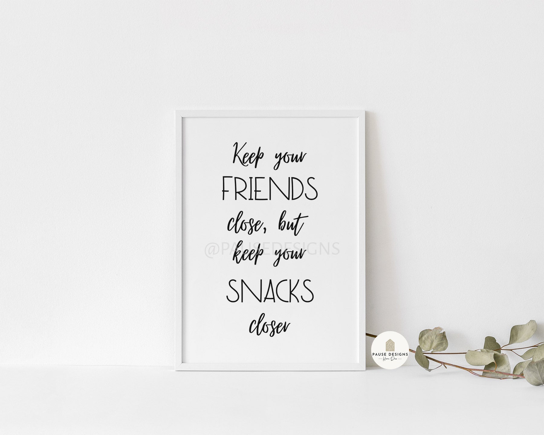 Our Keep Your Friends Close, But Keep Your Snacks Closer Print brings a minimalist décor style to your home with an element of fun and humour!